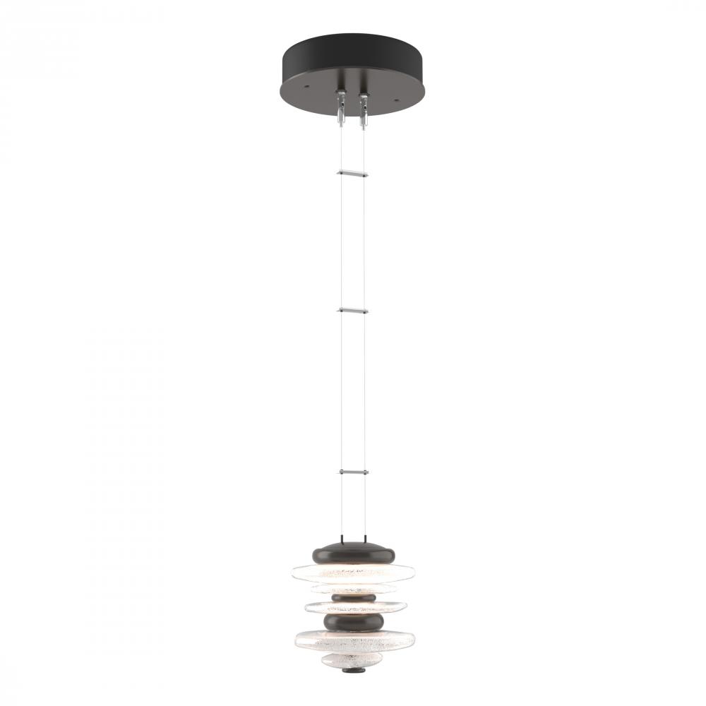 The Hubbardton Forge Cairn Pendant pays homage to the enigmatic stone sculptures, used since ancient times as landmarks. Thick hand-poured glass and cast steel “stones” are artistically stacked, and suspended by thin cables. Light flows over the steel and through the glass to seemingly glow from the inside. Also available as a Large Mini Pendant.