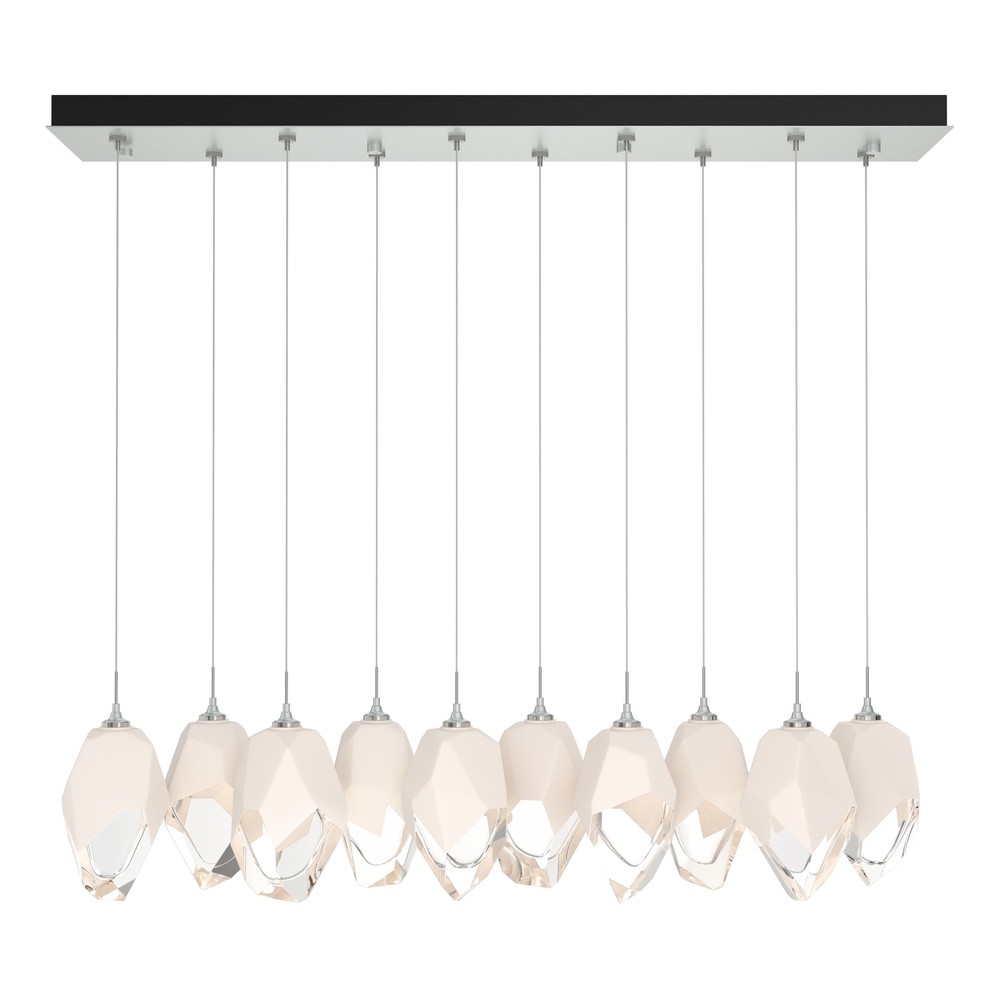 Ten Large Chrysalis pendants hung from a rectangular canopy. Each pendant may be individually adjusted for a custom look. Note, the upper canopy can will always be black while the canopy faceplate will match the selected finish.