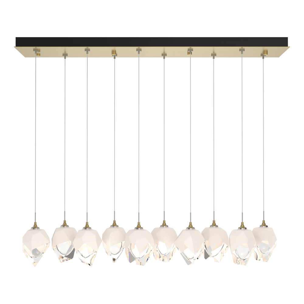 The Chrysalis 10-Light Small Crystal Pendant is a multi-port fixture that features ten small, handcrafted faceted glass crystals suspended from a rectangular canopy. A thick, clear layer of glass is encased in an outer cocoon of hand-blown, colored glass (matte black or white; all 10 are same color). Hand-polished like a gemstone, the lower portion of the outer layer of glass is removed to reveal the inner crystal clear layer below. Each crystal is lit from within.