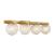The Savoy House Darien is a 4-light bath bar with fabulously chilly appeal. A minimal frame is finished in bold Warm Brass and holds four orbs of Ice Glass, adding sub-zero cool with tons of frosty texture. Darien is 7.25" in height, 33" in width and extends 7.25" from the wall. Uses four candelabra size bulbs of up to 60 watts per bulb. Bulbs not included. This bath bar is damp area rated.