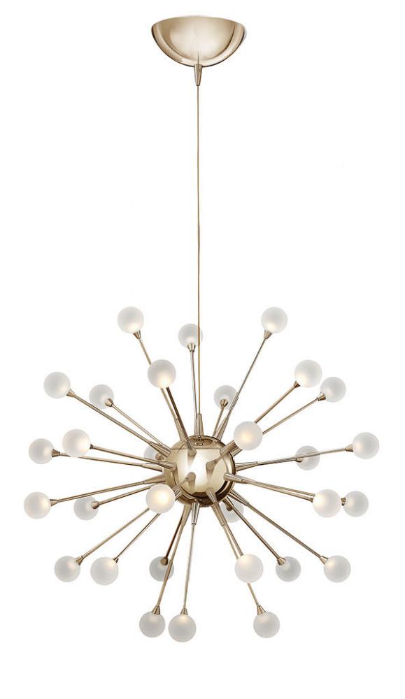 Impulse is a dynamic LED design with a striking contemporary shape. Petite stems radiate from the spherical body while miniature acrylic ornaments of light glow at its tips. An array of chic finishes in Polished Chrome, Polished Gold, and Cloud (White) intensifies its stunning effect.