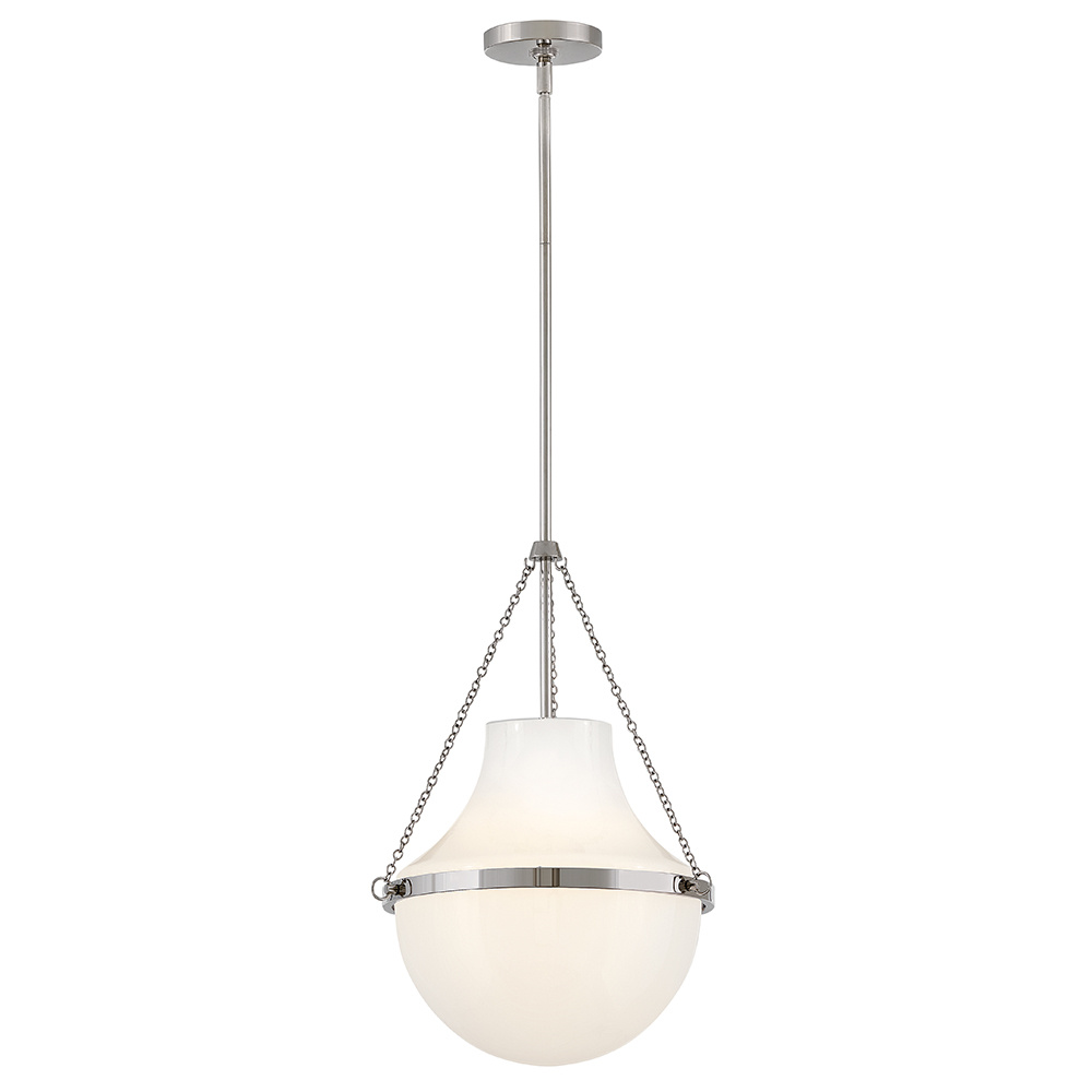 Fusing a sculpted, modern form with classically styled details, Collins features a transitional teardrop shade crafted from blown, cased opal glass. A central metal band and delicate chain uprights are available in Heritage Brass or Black Oxide finishes.