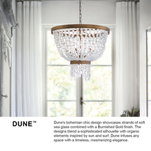 Dune's bohemian chic design showcases strands of soft sea glass combined with a Burnished Gold finish. The designs blend a sophisticated silhouette with organic elements inspired by sun and surf. Dune infuses any space with timeless, mesmerizing elegance.