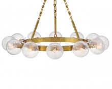 Dramatic crackled glass globes surround Coco’s timeless silhouette with unexpected, distressed detailing. Minimal framing suspended from decorative stem-to-chain uprights features a warm and inviting Lacquered Brass finish.