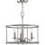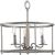 A round, open-cage frame coated in a farmhouse-style brushed nickel highlights the light fixture’s rustic demeanor.;Inside the frame nestle light bases reminiscent of vintage candlesticks on gently curving metal arms.;A wooden column at the ceiling light