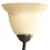 Hand painted Forged Bronze finish with black and brown tones.;Bell-shaped tea-stained glass.;Distinctive ebbing and flowing of flat steel arms and scroll accents.;Six feet of 9 gauge chain is supplied for ceiling chain mount.
