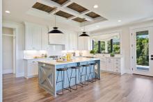 The simplistic design of the Perkins medium pendant is understated, yet refined. The decorative burnished brass band on the shallow-dome metal shade cinches at the top, creating the illusion of a swirling skirt. The white interior of the shade provides max