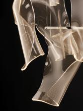 An airy arrangement of abstract forms, the Rinkle pendants feature sheets of transparent acrylic shaped by hand. The light guided acrylic captures the glow of energy efficient LEDs recessed within strips of shining stainless steel, obscuring the source of