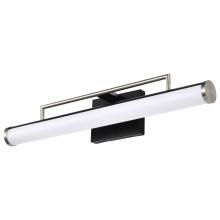 The design of the Solano 62-658 integrated LED medium bathroom vanity light is sleek and minimalist, with a simple yet elegant shape. The stylish fixture is finished in black with brushed nickel accents that accentuate the clean lines and broad backplate.