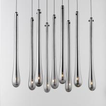 The classic teardrop glass shade is elevated in a luxurious collection of pendant configurations using substantially dense glass that are hand blown in elongated forms and curated into various color combinations. Suspended within the long, slender glass is