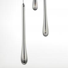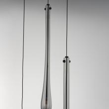 The classic teardrop glass shade is elevated in a luxurious collection of pendant configurations using substantially dense glass that are hand blown in elongated forms and curated into various color combinations. Suspended within the long, slender glass is