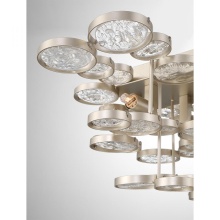 Choose intricate champagne silver, for a cool composed approach or antique gold lending itself to a warmer more deliberate option. The intricate frames surround delicately hand strung pressed glass wafers. The assemblage of each piece of craftsmanship float in cloudlike beauty.
