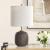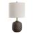 This Ceramic Base Features A Heavy Textured Surface Finished In A Warm Black, Accented With A Plated Antique Brass Details. The Round Hardback Drum Shade Is A Casual Light Gray Linen Fabric.