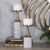 Set of Two Candleholders Feature An Antique Brushed Brass Finish and An Elegant White Marble Foot. Two 4"x 3" Off-white Distressed Candles Included. Sizes: S-5x10x5, L-5x13x5