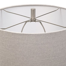 Showcasing A Rustic Casual Look, This Ceramic Table Lamp Features An Off-white Crackle Glaze with Distressed Rust Brown Details and Noticeable Ribbed Texture, Paired with Plated Brushed Nickel Accents. A Light Gray Linen Fabric Drum Shade Complements The Piece.