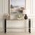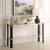 Contemporary Console Table Composed Of Stylish Iron Legs Finished In A Two-toned Matte Black And Gold Leaf. The Table Also Features Both A Top And Gallery Shelf Made Of Tempered Clear Glass Providing Ample Shelf Space And Elegance.