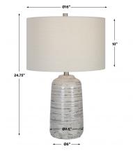 This Ceramic Table Lamp Has A Unique Shape Featuring A Traditional Style Urn Body That Has Cut Edges At The Bottom for A Subtle Contemporary Flair, Finished in An Ivory Glaze with A Heavy Striped Gray Drip and Brushed Nickel Plated Accents. The Lamp is Complemented By A Hardback Drum Shade in A Light Beige Linen Fabric with Natural Slubbing.