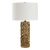 The Echo Table Lamp Features A Heavily Textured Surface With Jagged Edges And Deep Channels, Finished In A Heavily Antiqued Metallic Gold, Paired With Black Iron Accents. The Round Hardback Drum Shade Is Covered In A Casual White Linen.