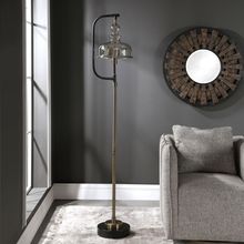 This Floor Lamp Features A Delicate Design Finished in A Plated Antiqued Brushed Brass and Rusted Aged Black, Featuring A Gracefully Curved Light Amber Glass Shade.