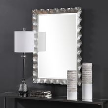 This Mirror Features A Hand Forged Metal Frame Finished in Silver Leaf with An Organic, Scalloped Edge Design. A Generous 1 1/4" Bevel is Added to This Piece, Which May Be Hung Horizontal or Vertical.
