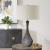 This Ceramic Table Lamp Features A Heavy Horizontal Texture Finished In A Rustic Dark Charcoal Glaze, Accented With Plated Brass Details. A Round Hardback Drum Shade Finished In A Casual Off-white Linen Fabric Completes The Piece.
