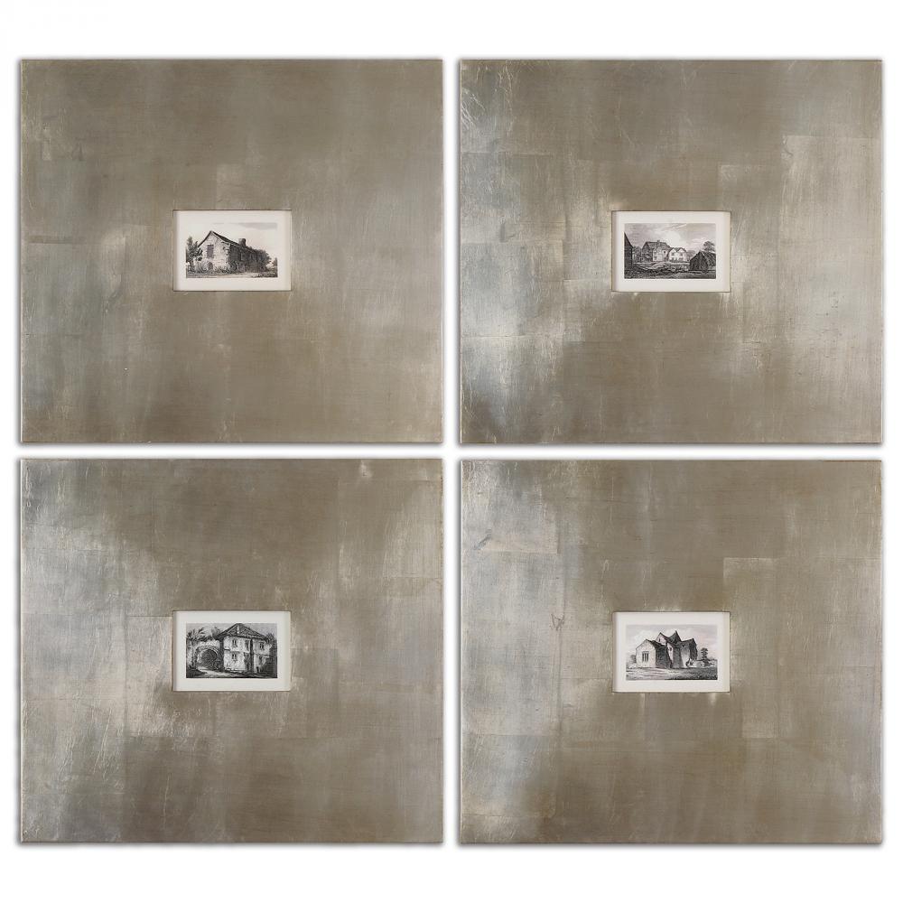 These Vintage, Architectural Prints Showcase A Simple, Black and White Color Scheme. These Prints Are Surrounded By An Elegant 8" Wide Frame with A Champagne Silver Leaf Base and A Light Brown Glaze. Each Print is Placed Under Protective Glass.