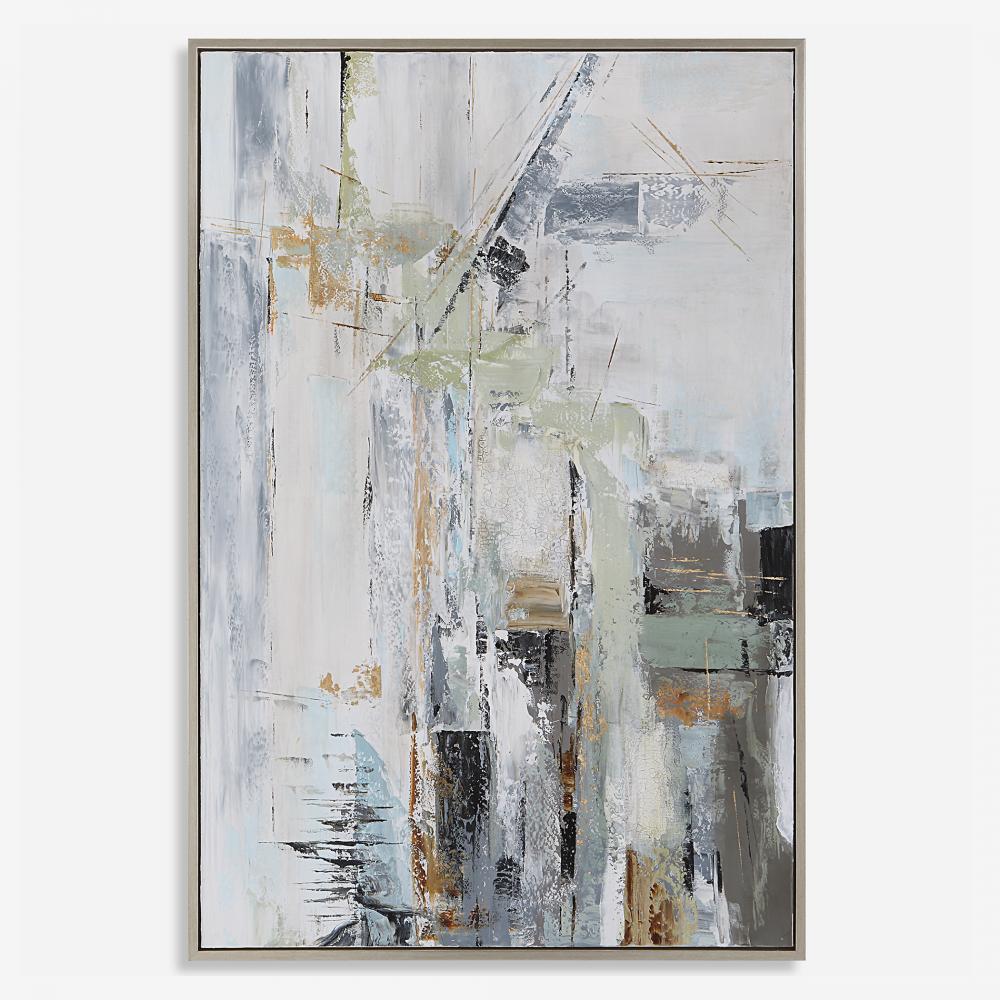 The Natural Springs Hand Painted Artwork Marries Modern Angular Elements with A Cool, Muted Color Palette. The Soft Sage, Blue, and Neutral Canvas is Accented By Hand Applied Crackle Texture and Subtle Gold Leaf Accents, Encased in A Silver Leaf Gallery Frame. May Be Hung Horizontal or Vertical.