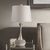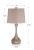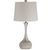 This Sleek Spun Metal Base Features A Plated Brushed Nickel Finish, Displayed on A Smoothed Natural Concrete Foot. The Tapered Round Hardback Shade is A Light Gray, Coarse Weave Linen Fabric.