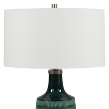 Finished in A Stunning Deep Teal Glaze, This Ceramic Table Lamp Features Hand Carved Organic Vertical Lines Accented with Brushed Nickel Details. The Lamp is Paired with A White Fabric Drum Shade.