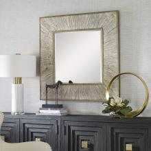 Rustic with A Twist, This Square Mirror is Constructed From Solid Wood in A Heavily Distressed Finish with Aged Whitewash. Iron Details Are Finished in Aged Gold. The Mirror Features A Generous 1 1/4" Bevel.