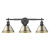 Bring industrial elegance into your home with the Yep by Golden Lighting Orwell 3-light Vanity. Featuring a Metal shade and a Matte Black frame, it creates a welcoming atmosphere. The Metal shade reflects a warm, antiqued glow with its Aged Brass finish, distinguished by a fine, circular brushed texture that adds visual depth and character. The epitome of clean, modern style, the Matte Black finish offers a smooth, non-reflective surface that absorbs light, making it an ideal complement to various decors. Suitable for damp locations like bathrooms and covered porches, this light fixture is perfect for providing practical task illumination. Requires 3 E26 Medium base bulbs (not included), with a maximum wattage of 100 per bulb. Overall dimensions are 27.25"W x 9.88"H x 8.5"D. Elevate your bathroom with this lighting solution that combines style and functionality.